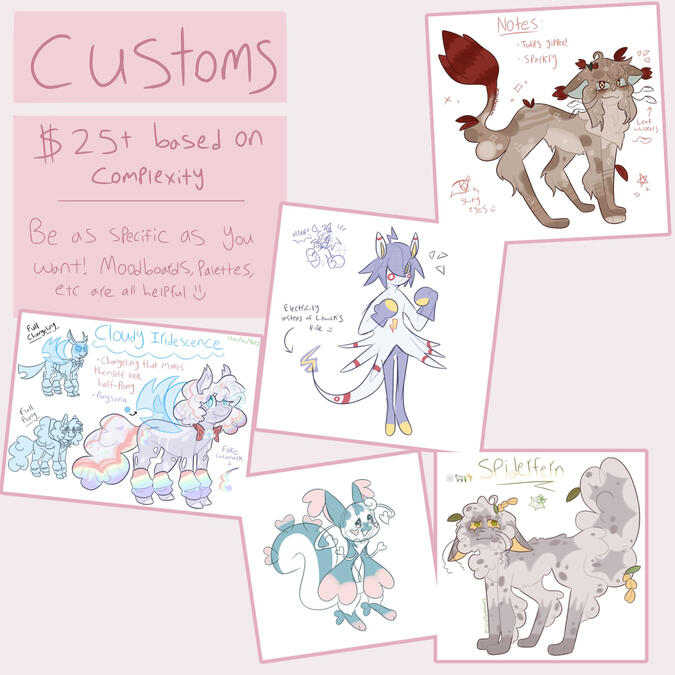 - I will try to design any species you want. (anthro, feral, humanoid, etc)- i can do fandom designs. (especially Warrior Cats and Pokemon!)- Be as specific as you want! Moodboards, palettes, aesthetics, etc all help.